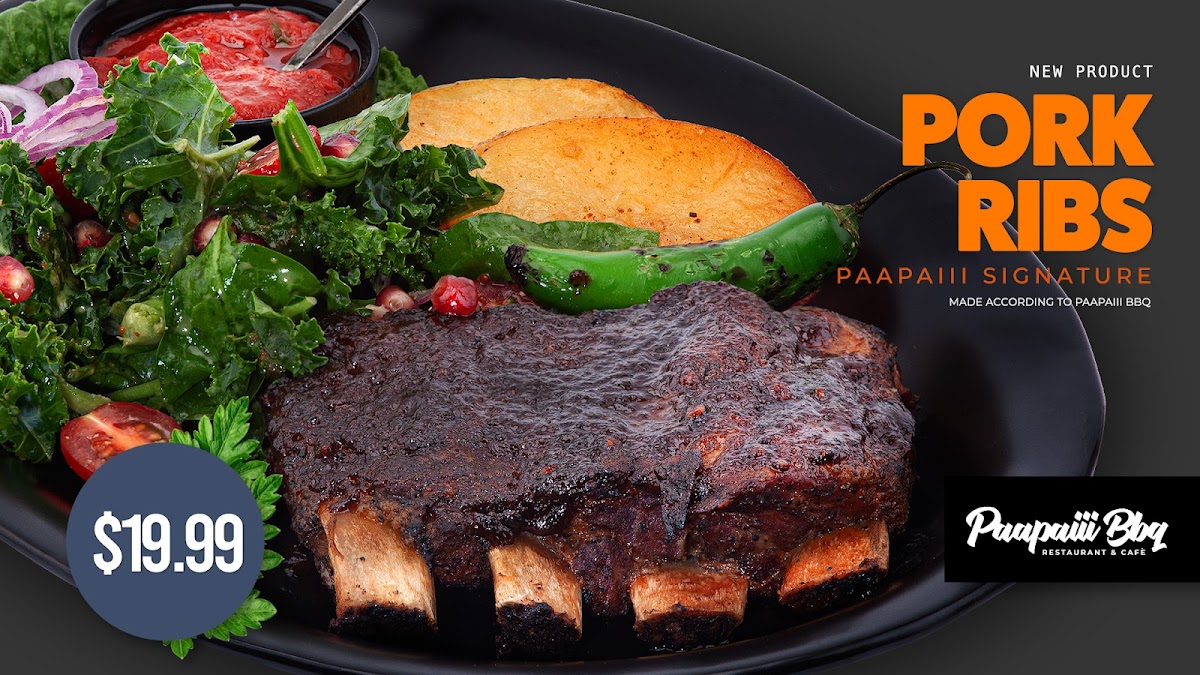 5 PCs: SERVED WITH SMALL TOMATO SLICE (2 PCs),2 PCS OVEN BAKED POTATO, PAAPAIII SIGNATURE SAUCE, HOT PEPPER,SLICED ONIONS AND GREENS, A SMALL CUT OF LAVASH. Tender Pork Baby Back Ribs seasoned with a flavorful blend of salt, black pepper, paprika, onion. These ribs are the perfect balance of smoky and savory